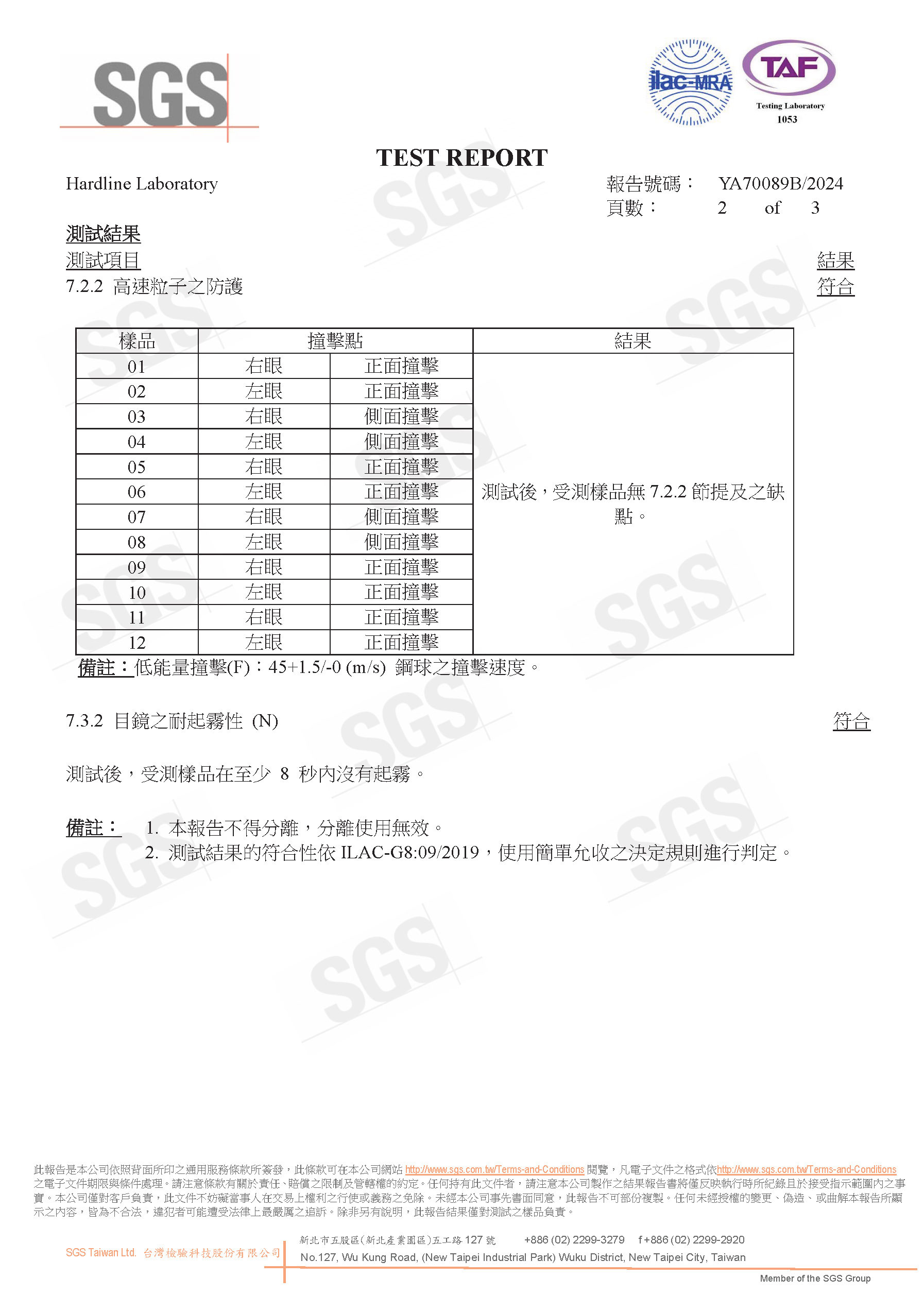 符合CNS 7177 Z2034撞擊和防霧型體測試